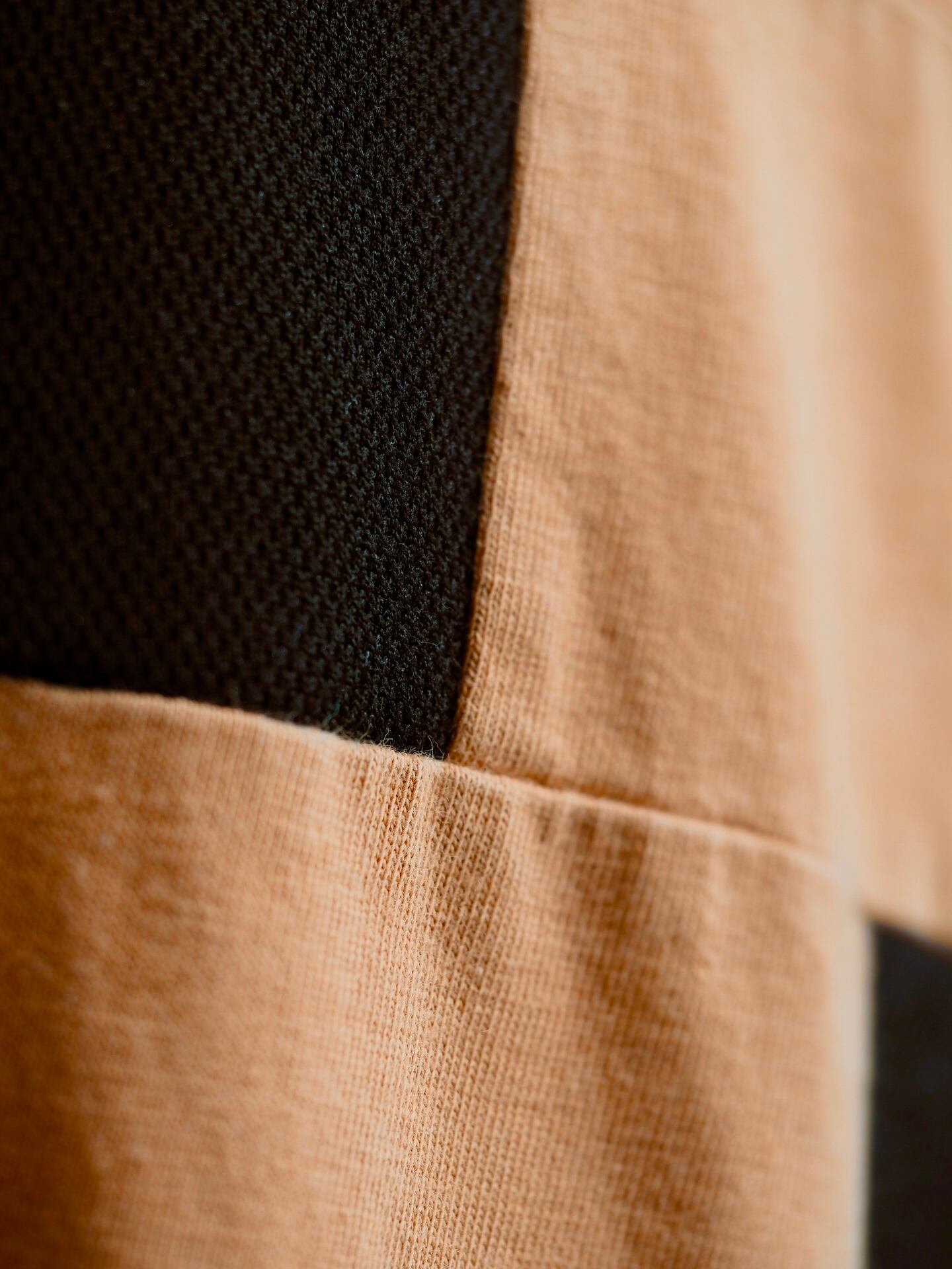 異素材を組み合わせた、幾何学的なデザインが特徴の、変なTシャツ。